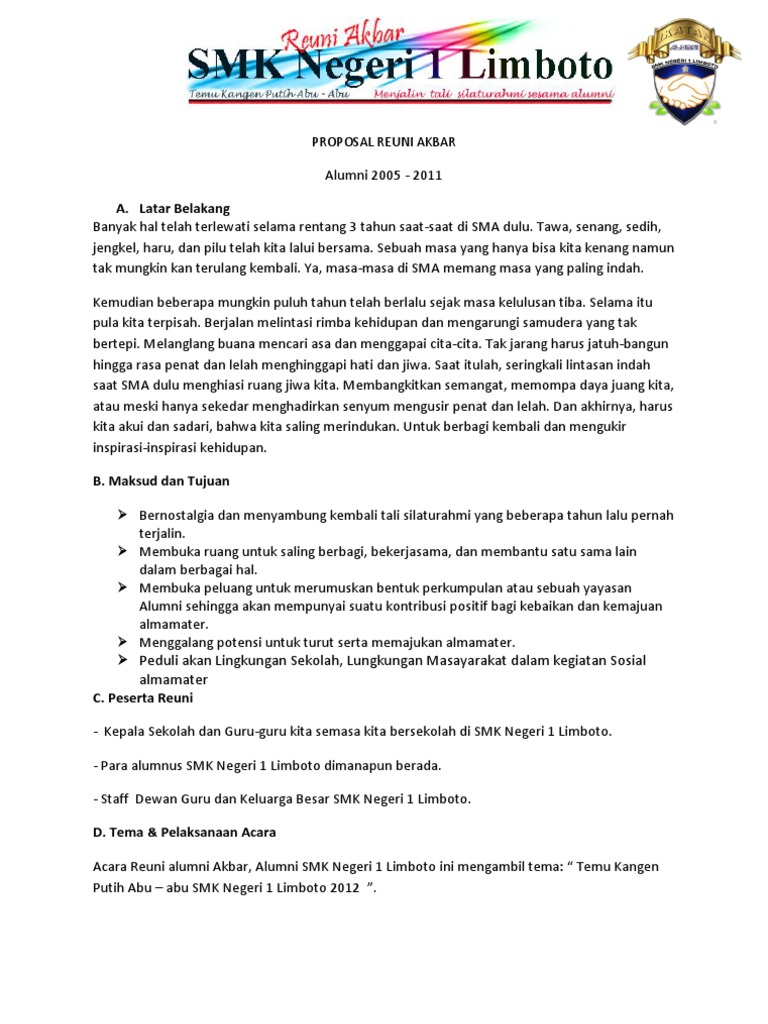 Proposal kegiatan untuk sekolah dibuat ketika sebuah sekolah atau lembaga pendidikan sedang melakukan suatu kegiatan. Pedoman pemilihan guru kepala sekolah dan pengawas sekolah. Struktur proposal non formal sama seperti proposal pada umumnya terdapat masalah, saran, pemecahanan, dan contoh proposal non formal yaitu proposal pengajuan reuni sekolah. Untuk kesuksesan acara reuni harus diketahui oleh banyak para alumni dengan cara : Kenangan dikala remaja semasa sekolah yang penuh dinamika terukir dengan manisnya. Contoh proposal reuni akbar sma, smk, ma atau yang sederajat. Semoga allah swt senantiasa meridhoi, memberikan kemudahan serta keselamatan bagi kita semua. Contoh proposal sekolah kegiatan perayaan hut ri 17 agustus. Sebuah masa yang hanya bisa kita kenang namun tak mungkin kan terulang kembali. Proposal penelitian disusun secara sistematis dan bersifat ilmiah, sehingga sudah. Termasuk didalamnya adalah masa yang penuh dengan gejolak. Reuni akbar semua angkatan unite the community agustus 2012 proposal reuni akbar smk n 1 pelepat ilir unite the community bab i pendahuluan. Data pendukung lainnya, biasanya berupa;